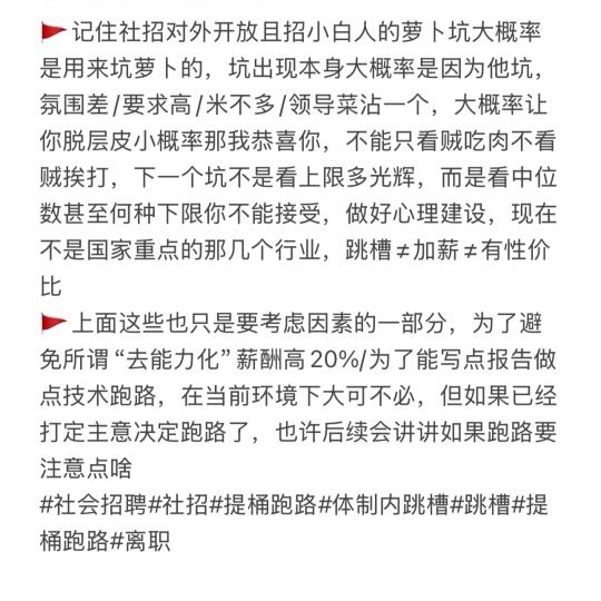 🚩记住社招对外开放且招小白人的萝卜坑大概率是用来坑萝卜的,坑出现本身大概率是因为他坑,氛围差/要求高/米不多/领导菜沾一个,大概率让你脱层皮小概率那我恭喜你,不能只看贼吃肉不看贼挨打,下一个坑不是看上限多光辉,而是看中位数甚至何种下限你不能接受,做好心理建设,现在不是国家重点的那几个行业,跳槽≠加薪≠有性价比