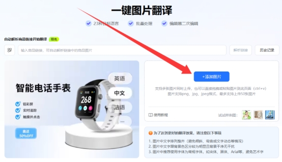 进入易可图,打开图片工具箱,选择图片翻译进入功能页面,然后将您要翻译的图片上传进来;