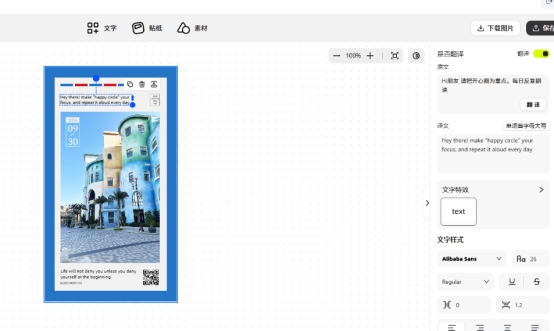 最后,我们点击下面那个“手动调整”按钮,可以打开一个在线编辑器窗口来进行更精细的二次加工,我们可以对文字进行移动、修改字号大小或者是更改字体类型等一系列操作,并且这个编辑器还自带了一个比较丰富的贴纸素材库供我们调取使用,所以在美化的时候我们也可以借助它们来提升整张图片的设计水准,最后确认好了所有的细节内容之后再点击下载就可以了。