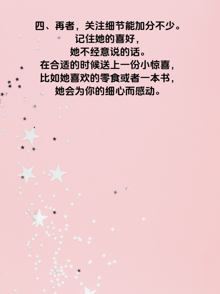 一、男生们,想让心仪的她心动不已吗?这里有4个超实用的方法。 二、首先,真诚是必杀技。在她面前展现最真实的自己,不做作,不伪装。分享你的喜怒哀乐,让她感受到你对她的信任,她会因你的真诚而心动。 三、制造专属回忆也很重要。一起去做一些特别的事,比如看一场只有你们的午夜电影,或者去一个小众却浪漫的地方。这些独特的经历会深深印在她心里。 四、再者,关注细节能加分不少。记住她的喜好,她不经意说的话。在合适的时候送上一份小惊喜,比如她喜欢的零食或者一本书,她会为你的细心而感动。 五、最后,保持自信的态度。相信自己的魅力,积极乐观地面对她。自信的你在她眼中会更具吸引力,让她忍不住为你心动。掌握这4个方法,开启让她心动的旅程吧!