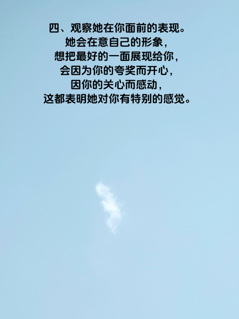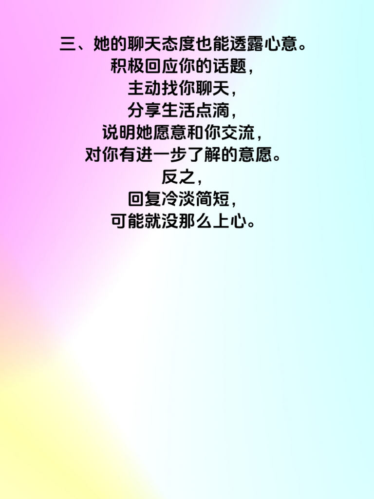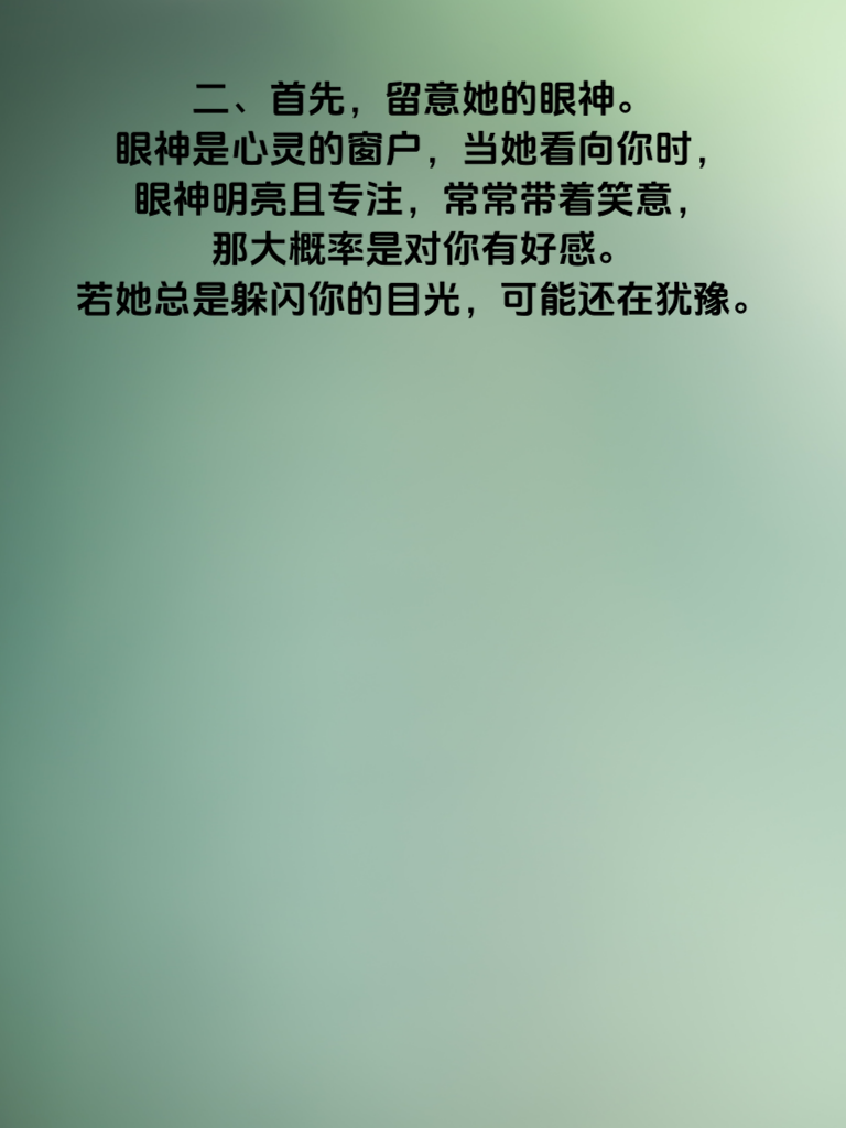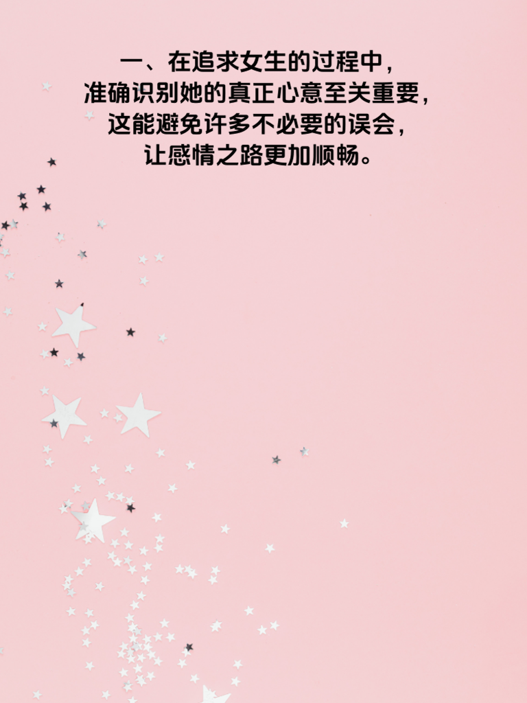 一、在追求女生的过程中,准确识别她的真正心意至关重要,这能避免许多不必要的误会,让感情之路更加顺畅。 二、首先,留意她的眼神。眼神是心灵的窗户,当她看向你时,眼神明亮且专注,常常带着笑意,那大概率是对你有好感。若她总是躲闪你的目光,可能还在犹豫。 三、她的聊天态度也能透露心意。积极回应你的话题,主动找你聊天,分享生活点滴,说明她愿意和你交流,对你有进一步了解的意愿。反之,回复冷淡简短,可能就没那么上心。 四、观察她在你面前的表现。她会在意自己的形象,想把最好的一面展现给你,会因为你的夸奖而开心,因你的关心而感动,这都表明她对你有特别的感觉。 五、还有她对约会的态度。欣然赴约,精心打扮,约会时全情投入,那她是重视和你相处的。若总是找借口推脱,可能她还没做好和你深入接触的准备。 六、通过这些细节去综合判断,就能更好地识别女生的心意,避开那些容易产生的误会,向着美好的感情勇敢迈进。