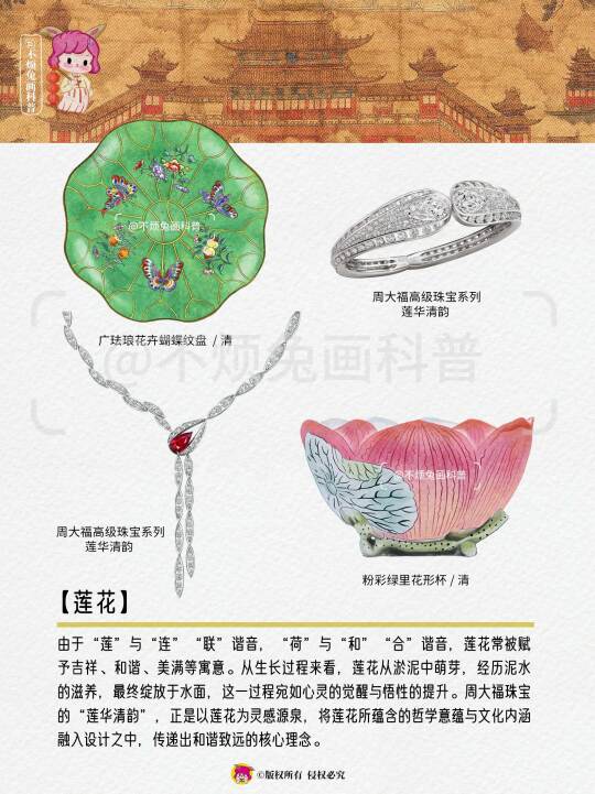 由于“莲”与“连”“联”谐音,“荷”与“和”“合”谐音,莲花常被赋予吉祥、和谐、美满等寓意。从生长过程来看,莲花从淤泥中萌芽,经历泥水的滋养,最终绽放于水面,这一过程宛如心灵的觉醒与悟性的提升。周大福珠宝的“莲华清韵”,正是以莲花为灵感源泉,将莲花所蕴含的哲学意蕴与文化内涵融入设计之中,传递出和谐致远的核心理念。