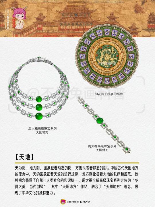 天为阳,地为阴,圆象征着动态的阳,方则代表着静态的阴。中国古代天圆地方的理念中,天的圆象征着天道的运行规律,地方则象征着大地的秩序和规范,这种观念强调了自然与人类社会的和谐统一。周大福全新高级珠宝系列定位为“华夏之美,当代创绎”,其中“天圆地方”作品,融合了“天圆地方”理念,展现了中华文化的独特魅力。