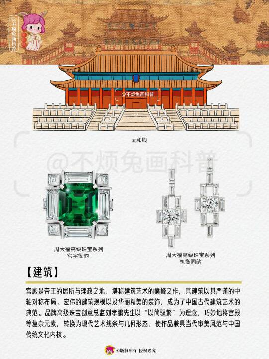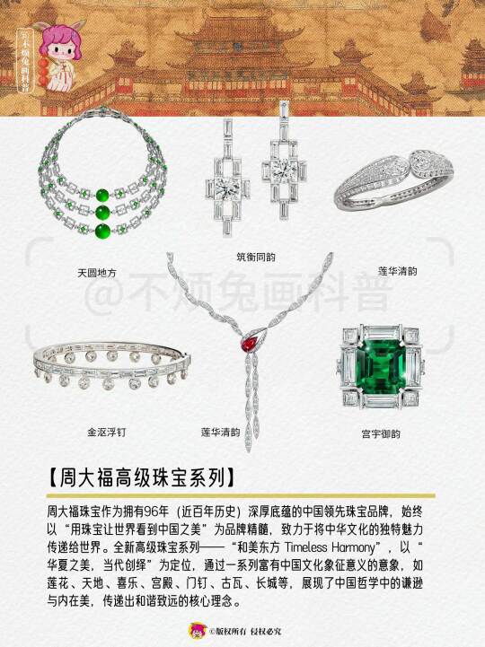 周大福珠宝作为拥有96年(近百年历史)深厚底蕴的中国领先珠宝品牌,始终以“用珠宝让世界看到中国之美”为品牌精髓,致力于将中华文化的独特魅力传递给世界。全新高级珠宝系列——“和美东方 Timeless Harmony”,以“华夏之美,当代创绎”为定位,通过一系列富有中国文化象征意义的意象,如莲花、天地、喜乐、宫殿、门钉、古瓦、长城等,展现了中国哲学中的谦逊与内在美,传递出和谐致远的核心理念。