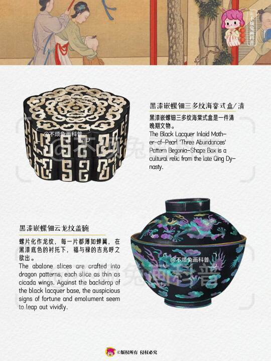 螺片化作龙纹,每一片都薄如蝉翼,在黑漆底色的衬托下,福与禄的吉兆呼之欲出。