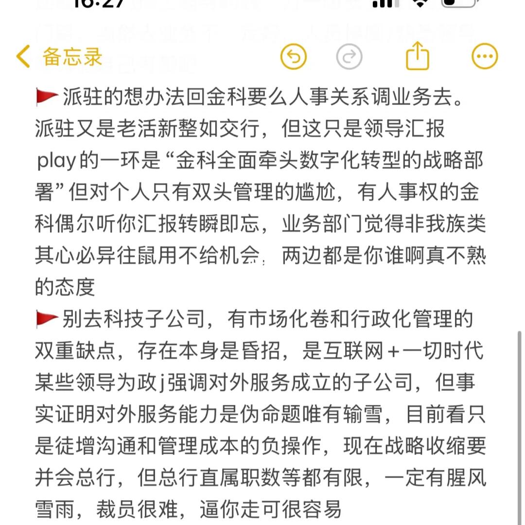 🚩别去科技子公司,有市场化卷和行政化管理的双重缺点,存在本身是昏招,是互联网+一切时代某些领导为政j强调对外服务成立的子公司,但事实证明对外服务能力是伪命题唯有输雪,目前看只是徒增沟通和管理成本的负操作,现在战略收缩要并会总行,但总行直属职数等都有限,一定有腥风雪雨,裁员很难,逼你走可很容易