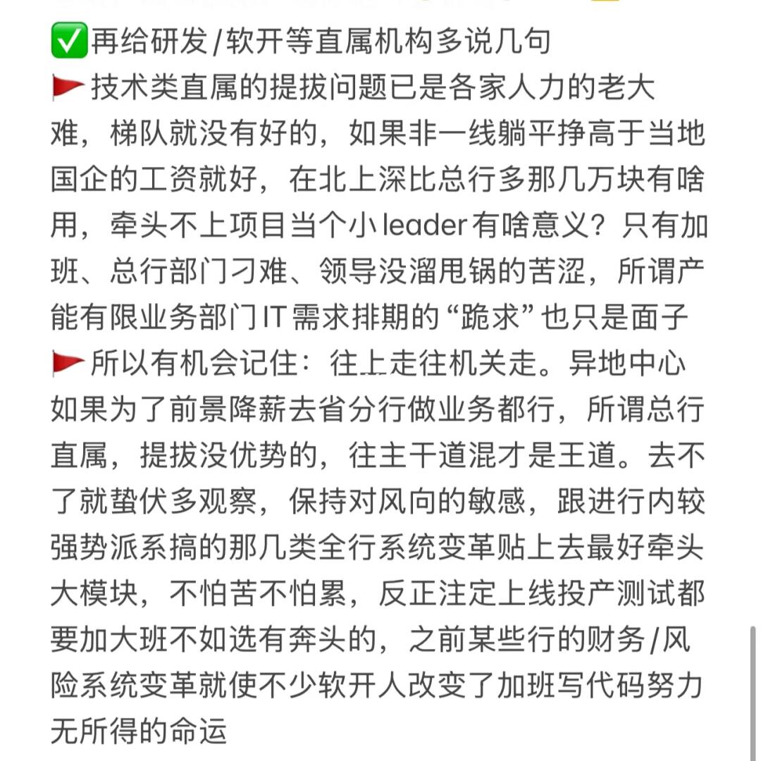 🚩所以有机会记住:往上走往机关走。异地中心如果为了前景降薪去省分行做业务都行,所谓总行直属,提拔没优势的,往主干道混才是王道。去不了就蛰伏多观察,保持对风向的敏感,跟进行内较强势派系搞的那几类全行系统变革贴上去最好牵头大模块,不怕苦不怕累,反正注定上线投产测试都要加大班不如选有奔头的,之前某些行的财务/风险系统变革就使不少软开人改变了加班写代码努力无所得的命运