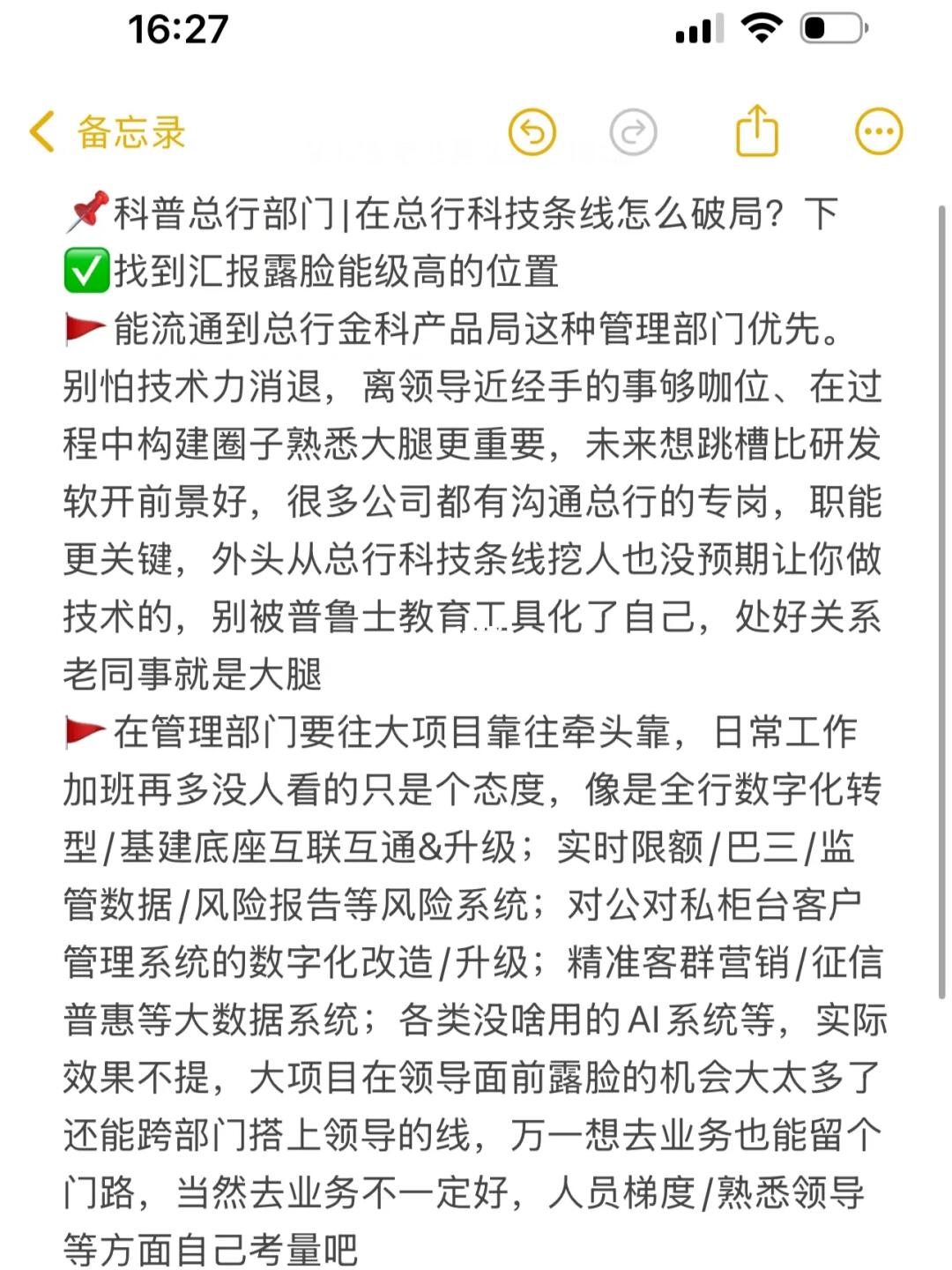 🚩在管理部门要往大项目靠往牵头靠,日常工作加班再多没人看的顶多看个态度。像是全行数字化转型/基建底座互联互通&升级;实时限额/巴三/监管数据/风险报告等风险系统;对公对私柜台客户管理系统的数字化改造/升级;精准客群营销/征信普惠等大数据系统等,实际技术力不重要,主要看对应领导重视程度,重视就猛争取,在领导面前露脸的机会比啥都重要,还能跨部门搭上领导的线万一想去业务也能留个门路(去业务不一定好,人员梯度/熟悉领导等方面自己斟酌