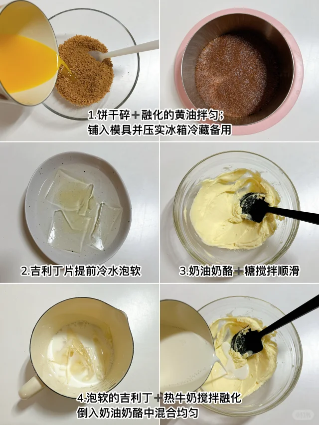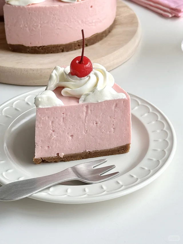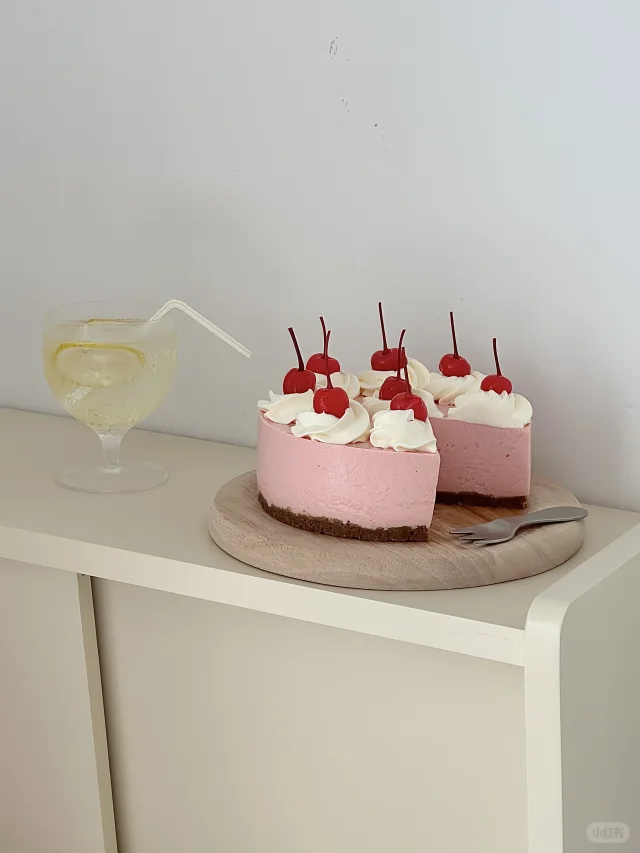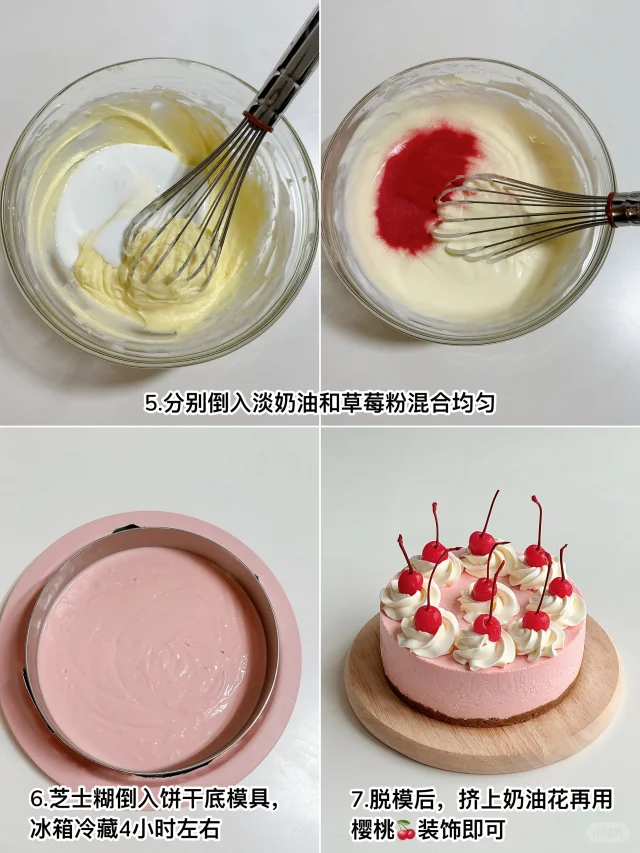 做法参考P5/P6 不用开烤箱的甜品🍧太适合夏天了 吃起来冰冰凉凉 口感不要太顺滑😜 🍒 食材: 饼干碎100g|融化的黄油45g|奶油奶酪250g|糖40g|淡奶油300g|吉利丁片10g|草莓粉15g|热牛奶 60g 奶油花:淡奶油70g➕糖6g打发 🍒 做法 ❶饼干碎➕融化的黄油拌匀,铺入模具放冰箱冷藏 ❷奶油奶酪➕糖搅拌顺滑 ❸提前泡好的吉利丁片与热牛奶🥛混合搅拌融化,再倒入步骤2的奶酪中混合 ❹倒入淡奶油和草莓粉🍓混合,然后倒入饼干底模具中,入冰箱冷藏4小时左右脱模 ❺奶油花食材打发挤在蛋糕上,再用樱桃装饰即可 -