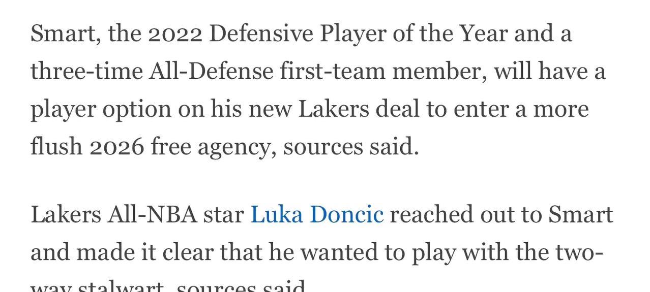 Dan Woike: Shams: 斯玛特是2022年DPOY,三次入选最佳防守一阵,他与湖人的合同包含第二年球员选项,因此可能会进入明年更火热的自由市场。 消息人士透露,湖人球星东契奇招募了斯玛特,明确表示希望能与这位攻防俱佳的悍将并肩作战。