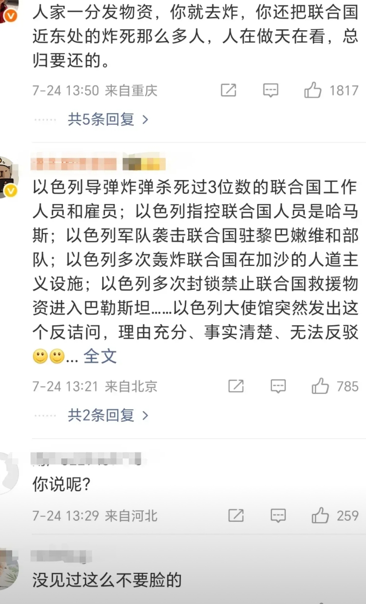 我从未见过如此厚颜无耻之人。 以色列和联合国在东大Vb上吵架。以色列驻华使馆(lP在香港)质问联合国:950辆援助卡车在加沙等待联合国分发,为什么联合国不分发? 底下的评论区,骂小以骂得粪水横流:人家一分发物资,你就去炸。 你把人家联合国近东救济机构的工作人员手拷起来了,衣服脱了,被你扣押,打死了一批人,又饿晕了一批人,你让他们咋个整?!还拿签证卡人,不让外界的人进入加沙。 以色列的外宣堪称灾难级。明知在东大发文会被骂,它还主动找骂。当然人家也不在乎这些。毕竟,只要它的好大儿阿美还活着,以色列就能继续对着全世界哈气。