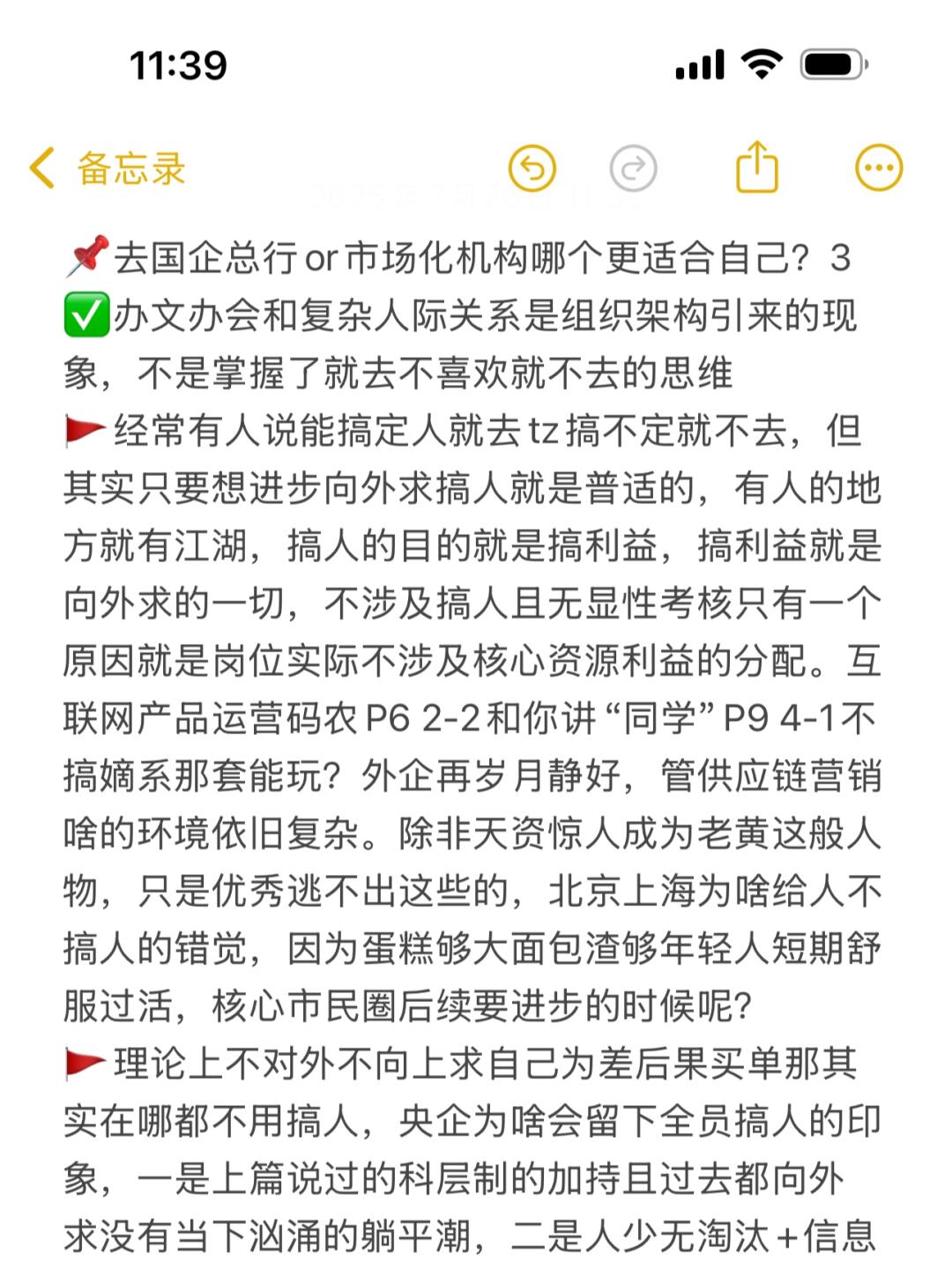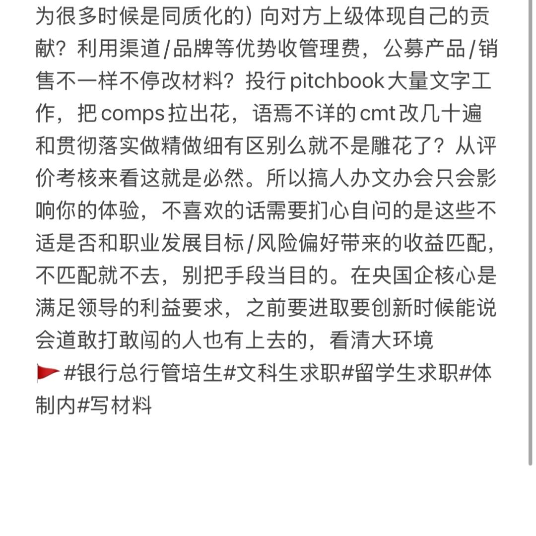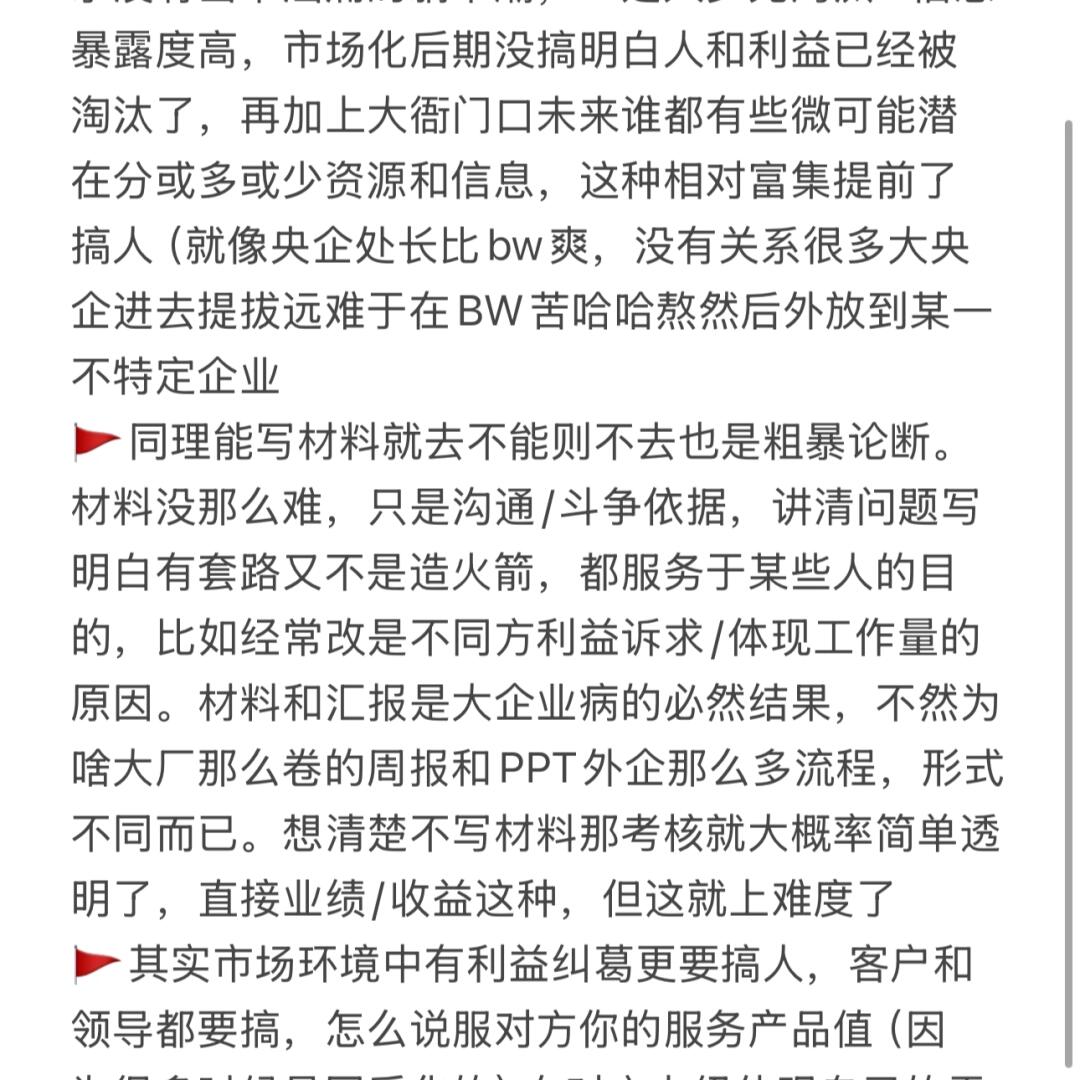 🚩其实市场环境中有利益纠葛更要搞人,客户和领导都要搞,怎么说服对方你的服务产品值(因为很多时候是同质化的)向对方上级体现自己的贡献?利用渠道/品牌等优势收管理费,公募产品/销售不一样不停改材料?投行pitchbook大量文字工作,把comps拉出花,语焉不详的cmt改几十遍和贯彻落实做精做细有区别么就不是雕花了?从评价考核来看这就是必然。所以搞人办文办会只会影响你的体验,不喜欢的话需要扪心自问的是这些不适是否和职业发展目标/风险偏好带来的收益匹配,不匹配就不去,别把手段当目的。在央国企核心是满足领导的利益要求,之前要进取要创新时候能说会道敢打敢闯的人上去的一堆…