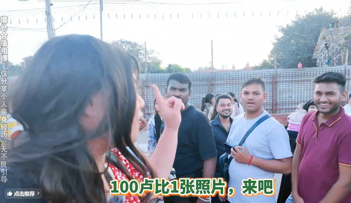 博主此时才发现自己被包围了,不过他还是机智的想出了应对之策,镇定的说,100卢比一张照片,来吧。