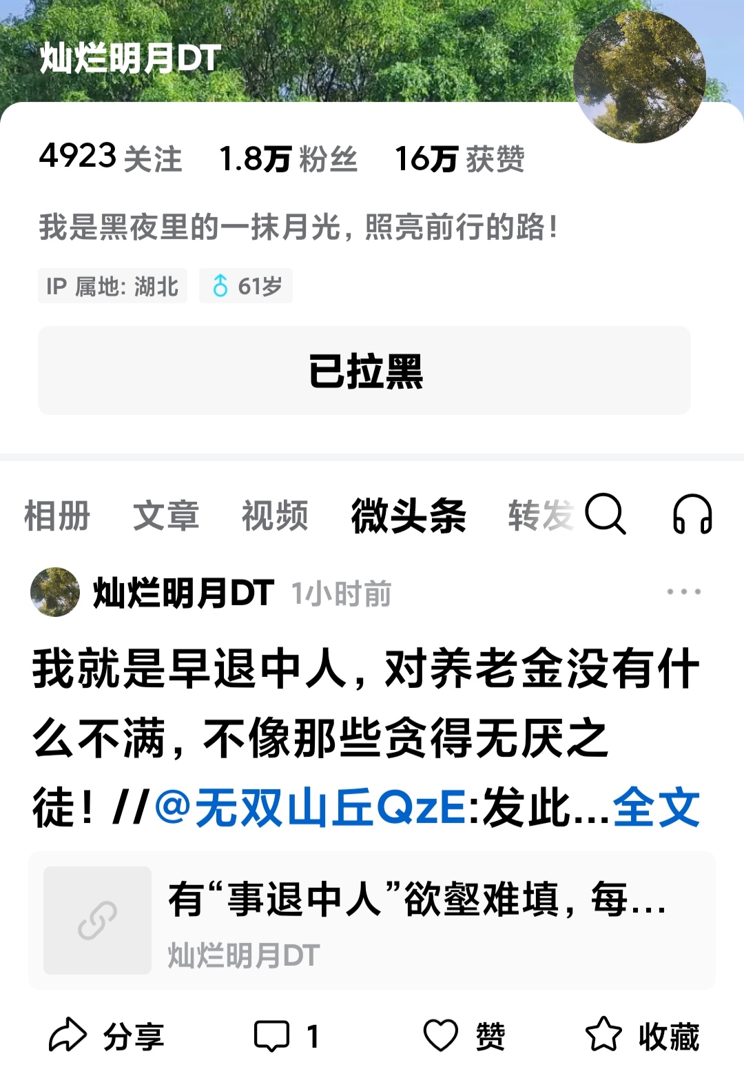 我马上登陆了这个人的主页,发现他的年龄竟然是61岁。这哪是什么早退中人啊?于是,我果断将其拉黑了。对于这些缺乏良知的人,唯一的办法就是远离。