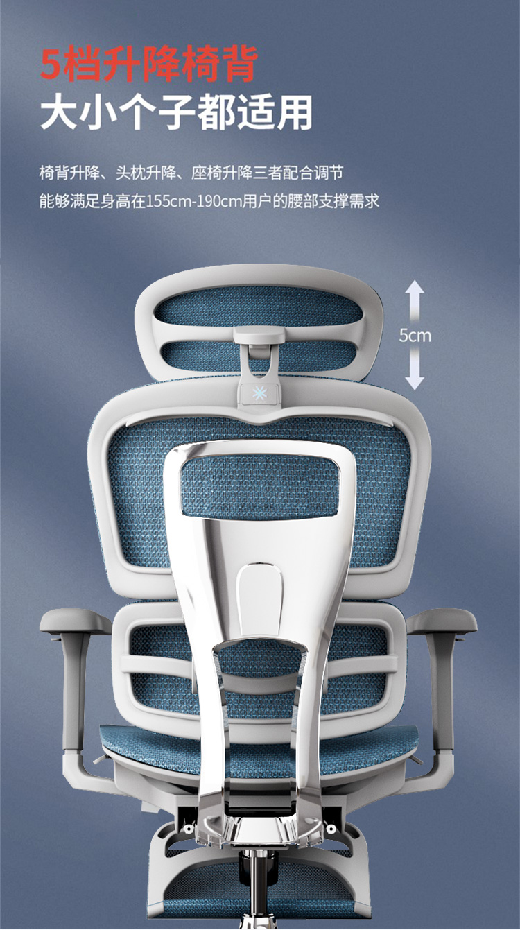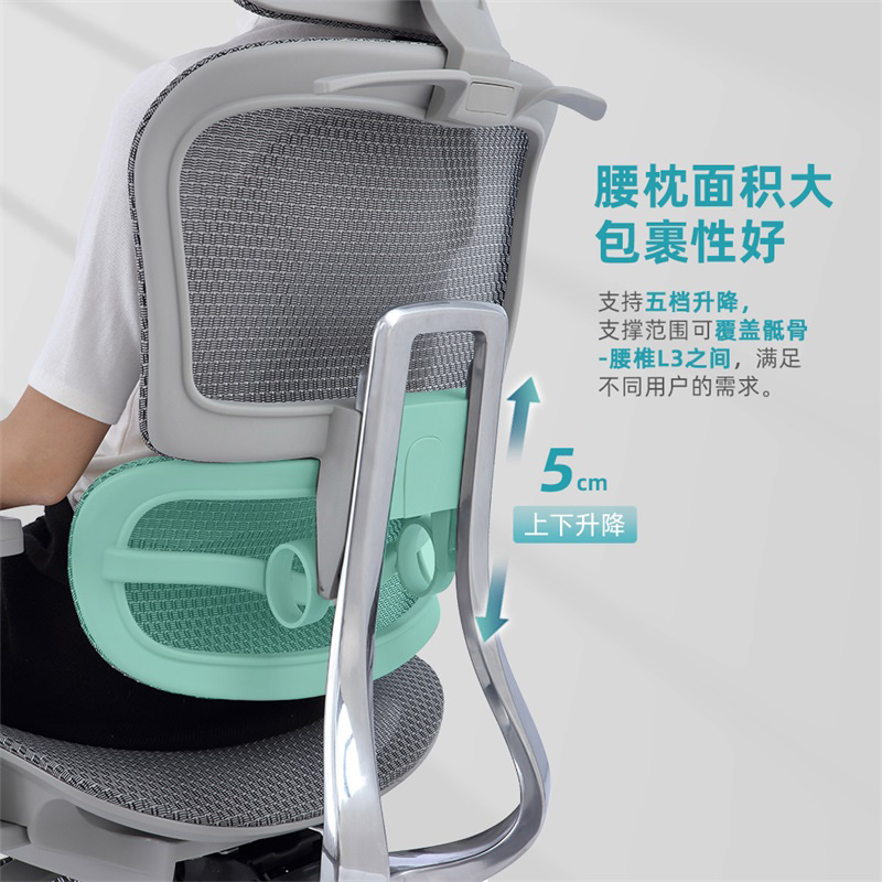 •腰背分离式设计:椅背可独立升降,适配不同身高用户的腰椎位置;搭配自动弹力调节腰枕,能根据体重自动调整支撑力度,90斤到200斤用户都能获得贴合腰线的支撑,缓解腰椎压力,告别“久坐腰酸”。
