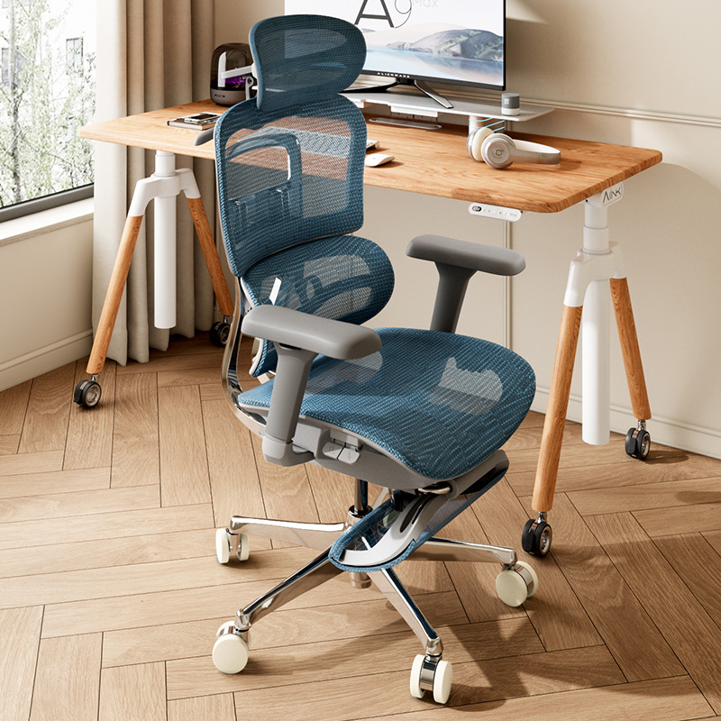 初见爱琳AY838,最吸睛的莫过于简约时尚的外观与实用工学设计——主体采用灰色或蓝色尼龙加纤框架,搭配高弹力杜邦网布,色调沉稳大气,摆进办公室显专业,放在家庭书房不突兀,适配现代简约、轻奢等多种装修风格。网布表面细密透气,37℃高温天坐久了也不闷汗,触感柔软却不失支撑力,彻底告别传统办公椅的闷热与僵硬。