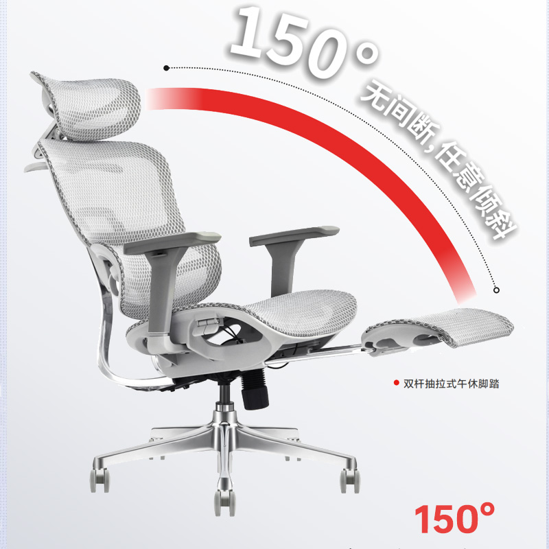 •椅背倾仰角度可达150°,搭配抽拉式午休脚踏,午休时可平躺放松,脚架与椅背的承重设计经过反复验证,躺卧时不晃不塌,安全系数拉满。