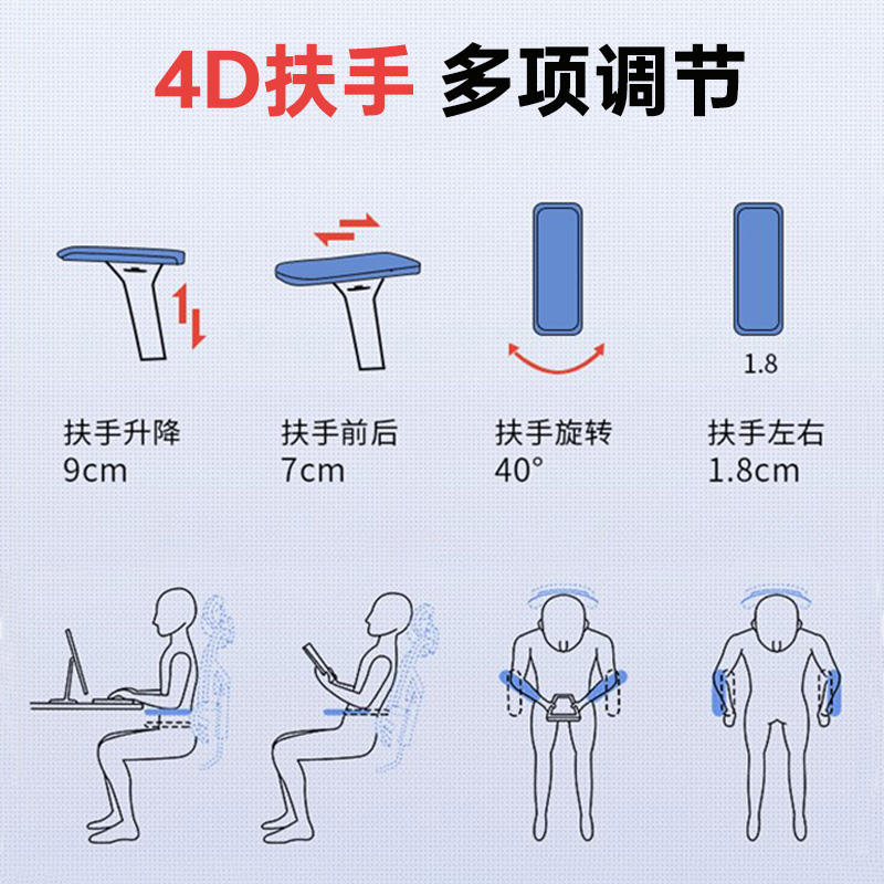 •4D-PU扶手:可实现高低升降、角度旋转、前后调节与平行面滑动,打字时托住手肘、休息时搭放手臂、午休时贴合身体,全方位减少手臂悬空带来的肌肉紧张。