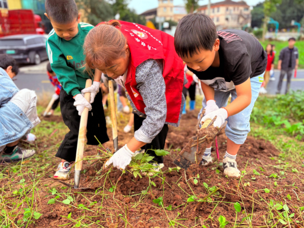 金秋十月的阳光洒在银杏园社区和谐人口文化广场,10月19日,四川省成都市天回镇街道银杏园社区关工委开展的"从一粒种子到一片绿意"农耕文化传承人活动准时启幕。多位孩子雀跃着围拢在"共享菜园"边,他们放下手机和平板,鼻尖第一次如此近距离地触到泥土的潮湿气息。社区园艺达人把铁锹、锄头、小耙子一字排开,用带着泥土味的故事把"开垦第一课"讲得活色生香:铁锹要像朋友一样握手,锄头下去前要先弯腰问好,孩子们听得眼睛发亮,仿佛手里的工具瞬间有了生命。