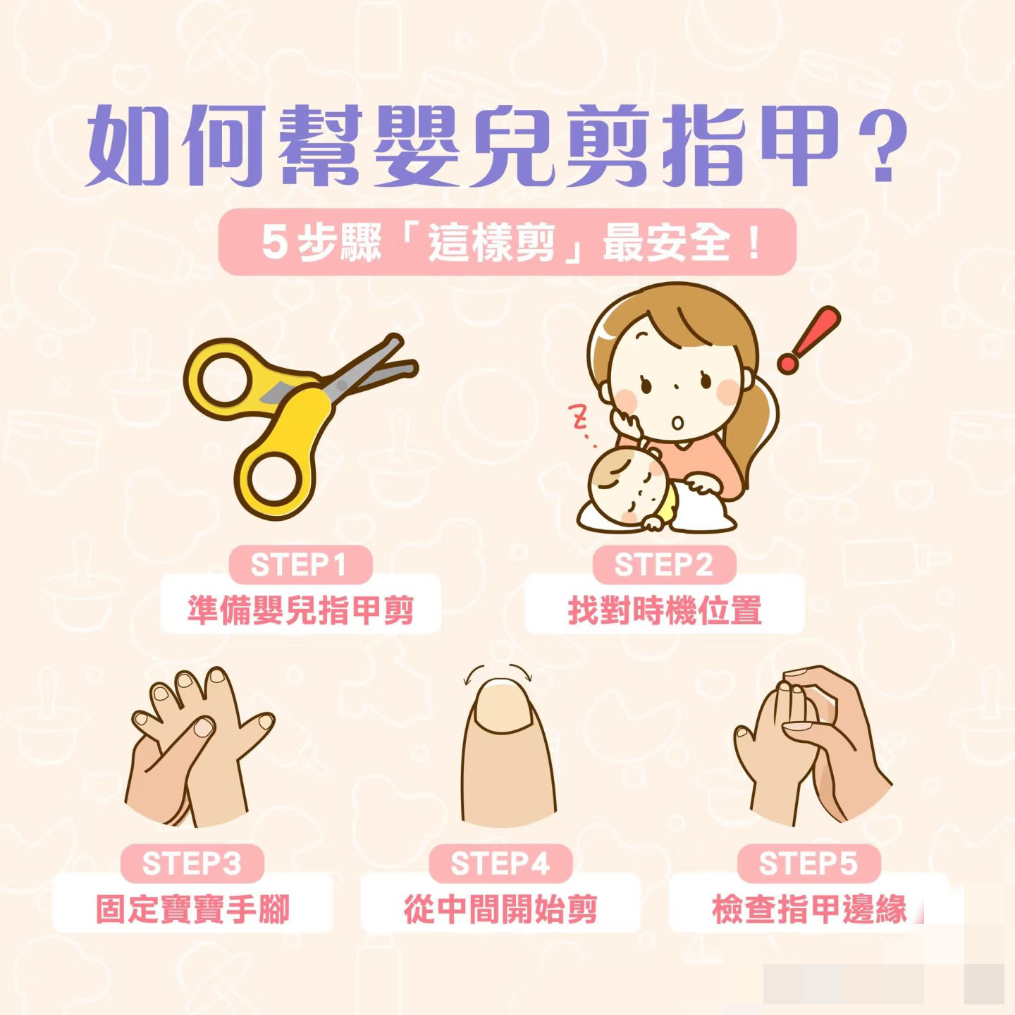 · 频率问题:宝宝新陈代谢快,指甲长得也快,手指甲大约每周需要修剪1-2次,脚趾甲每月1-2次即可。