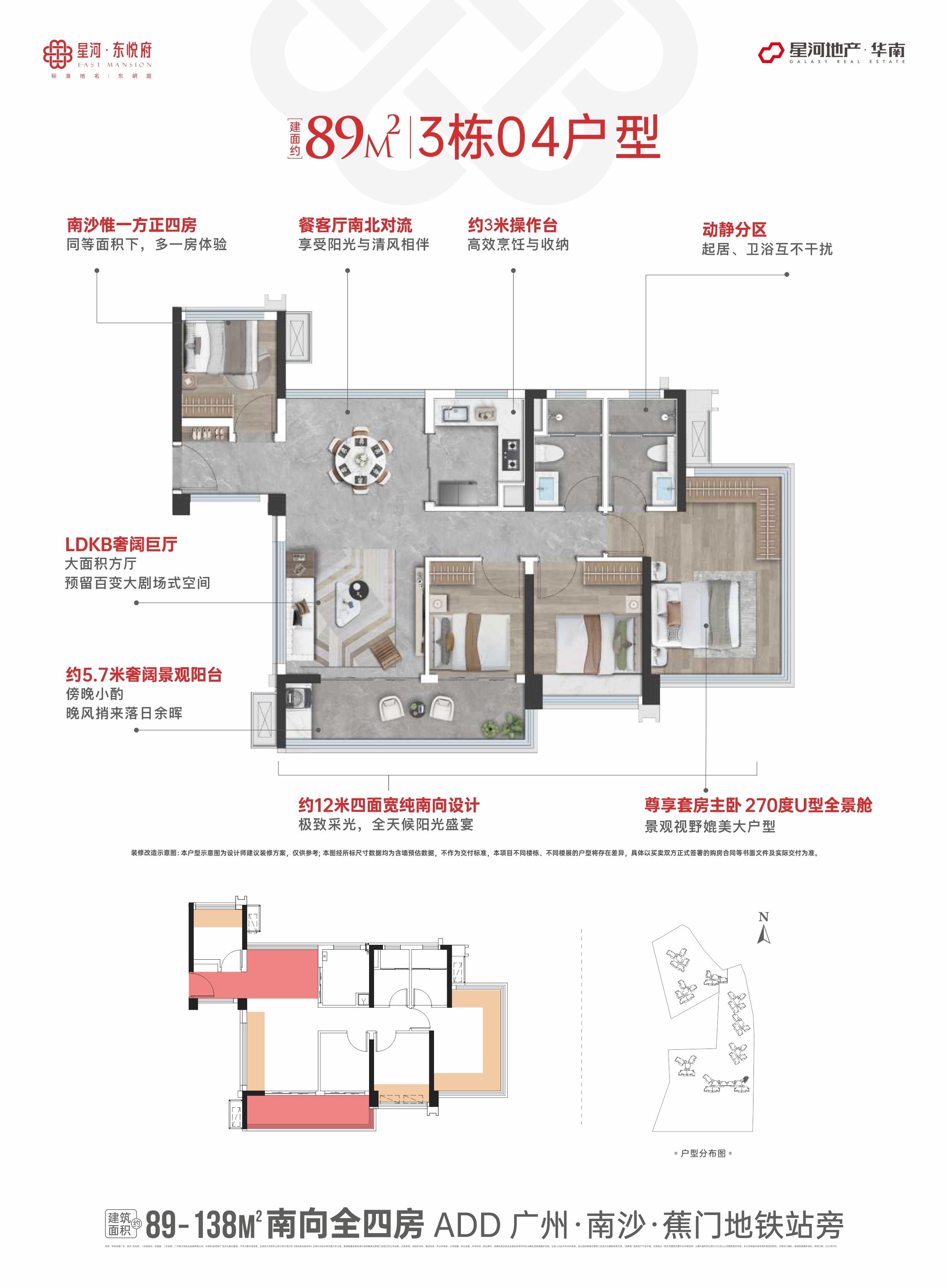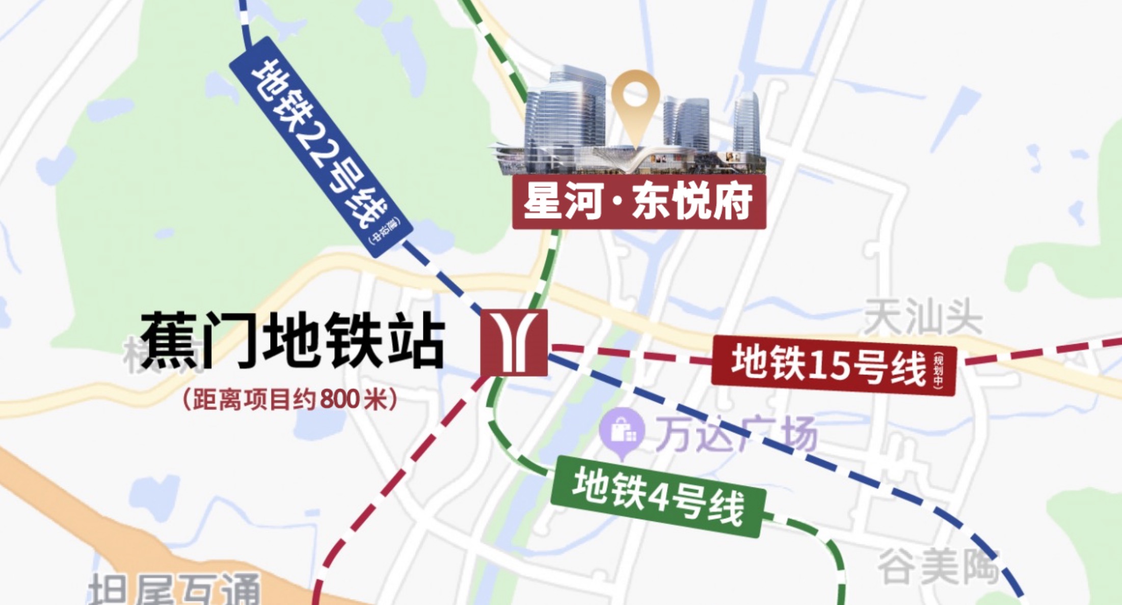 星河东悦府在交通优势仅次于星河东悦湾三期,距离蕉门交通枢纽步行 7 分钟(约610 米)。不仅有地铁4号线,更有跨区的快速公交可以无缝连接天河、越秀等区域甚至还有跨城的快速公交,走深中通道到深圳保安机场、前海仅需40分中左右。另外规划的南沙环线15号线两站接驳横沥岛,跨城地铁22号线不仅可以快速通达市区,还能跨城到东莞、深圳。