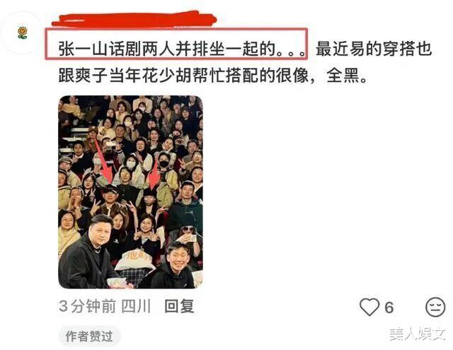 11 月 14 日,张一山主演的话剧《一地鸡毛》首演,一场艺术盛宴却意外成为胡彦斌与易梦玲恋情的又一见证地。现场的大合照中,两人并排而坐,距离相近,虽然易梦玲包裹严实,但从身形与穿搭风格等细节,仍被眼尖的网友认出。随后,两人还同步在社交平台为张一山宣传话剧,言语间的默契,让人不禁猜测他们私下的关系早已不一般。