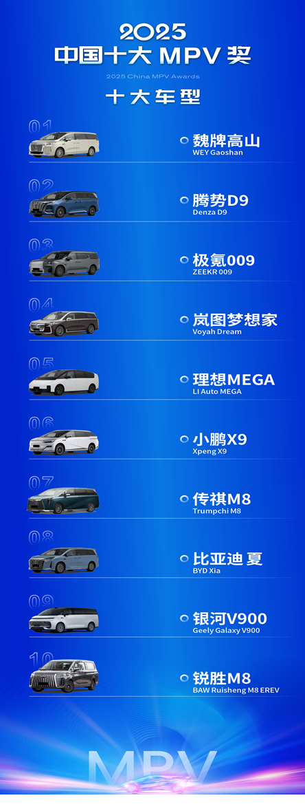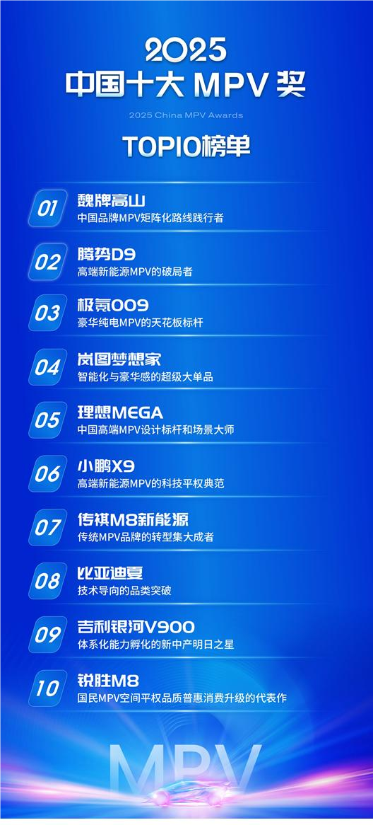日前,亚洲汽车研究所联合全球多家汽车媒体发布“2025年中国品牌十大MPV奖”榜单,面上看榜单涉及10款车,但其呈现的行业意义远非如此。
