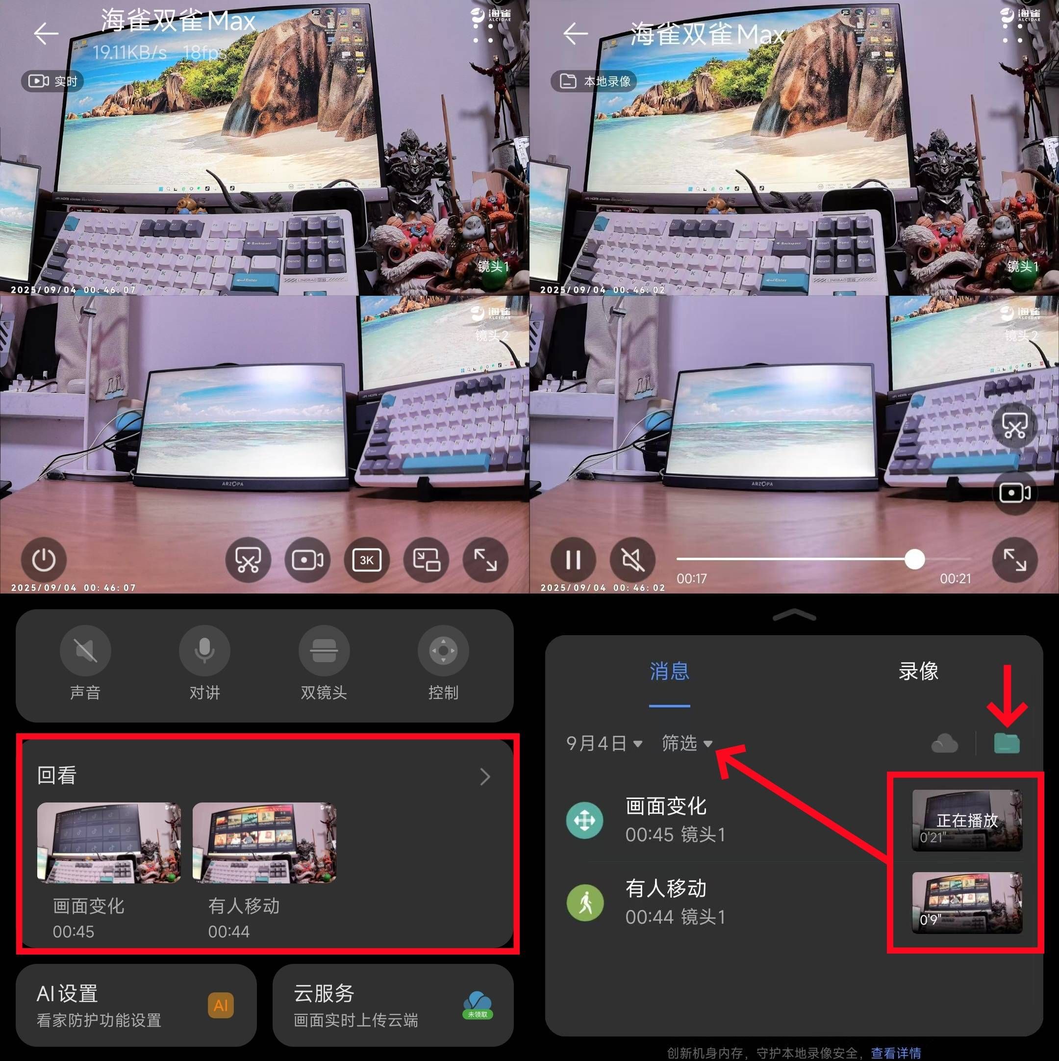 ▲作为一款具备两个摄像头的智能设备,点击“双摄头”可单独查看,也可以一起查看(默认),甚至可以实现海雀旗下智能安防产品联动多路同屏显示,构建生态安全天网。