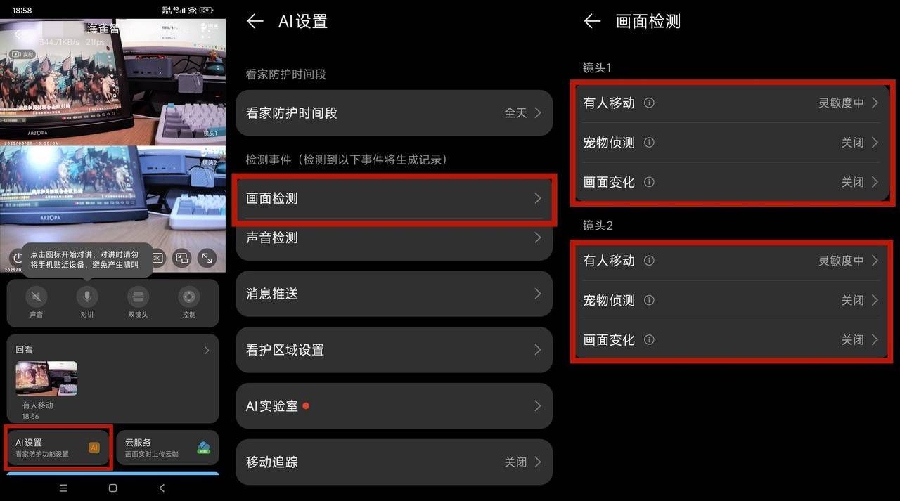 ▲在“AI设置”中可对双雀Max进行更进一步的设置,如“画面检测”模块,可分别对两个镜头使用AI算法对“有人移动(默认灵敏度中)”“宠物侦测(默认关闭)”“画面变化(默认关闭)”进行设置,可根据需求开启或关闭。