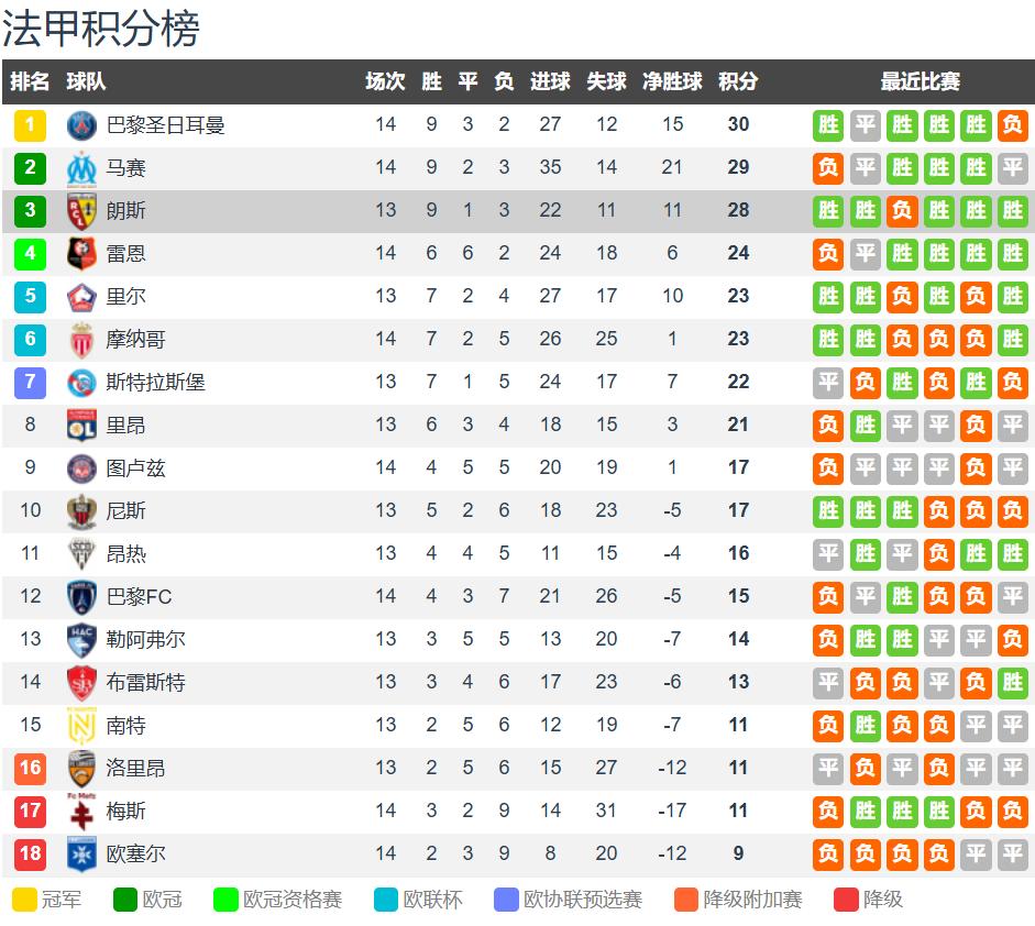 摩纳哥1-0巴黎,不仅结束了自己的法甲联赛三连败,也终结了巴黎的法甲联赛三连胜。这样巴黎在先赛的情况下积30分依然排名第一,但仅领先第三名朗斯2分,本轮法甲,朗斯客战昂热,若朗斯能全取3分的话,他们在法甲积分榜上即可反超巴黎1分实现登顶。