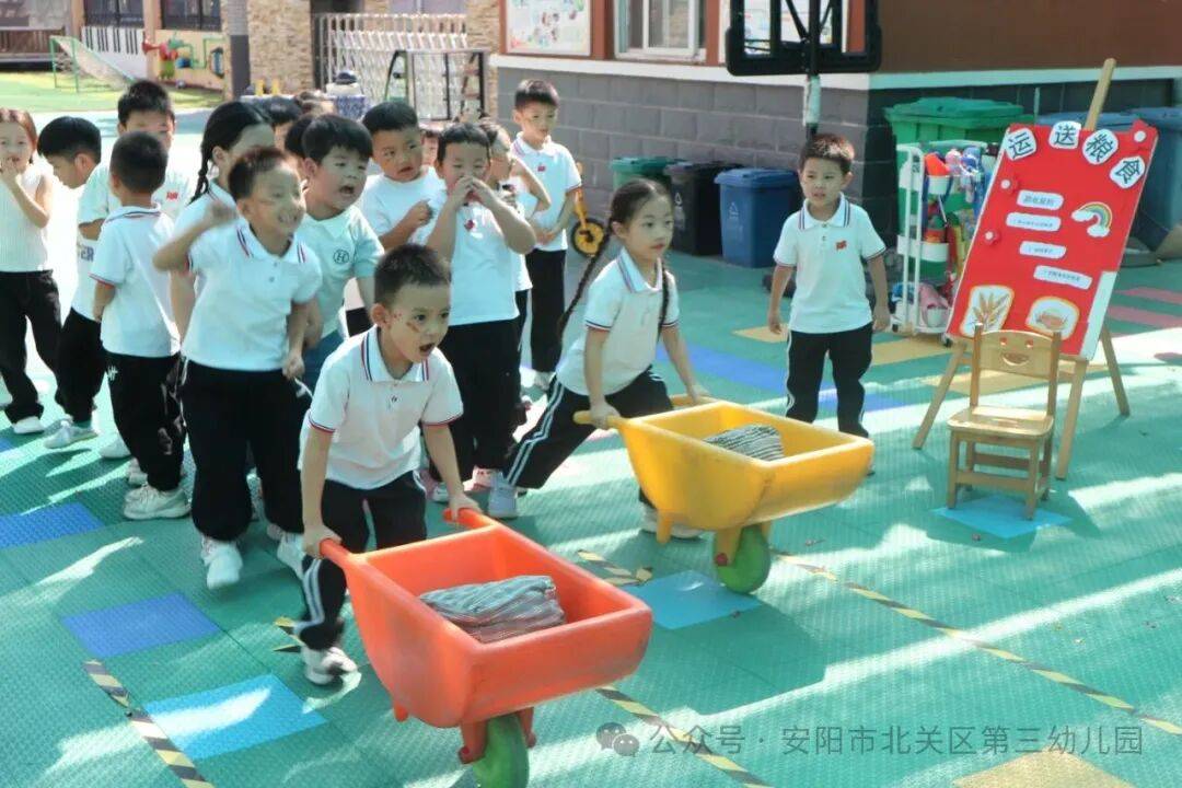 “加油!加油!”在“运送军粮”的赛场上,小朋友们斗志昂扬。双手紧握小推车,载着沉甸甸的“粮食”,目光坚定地望向终点。