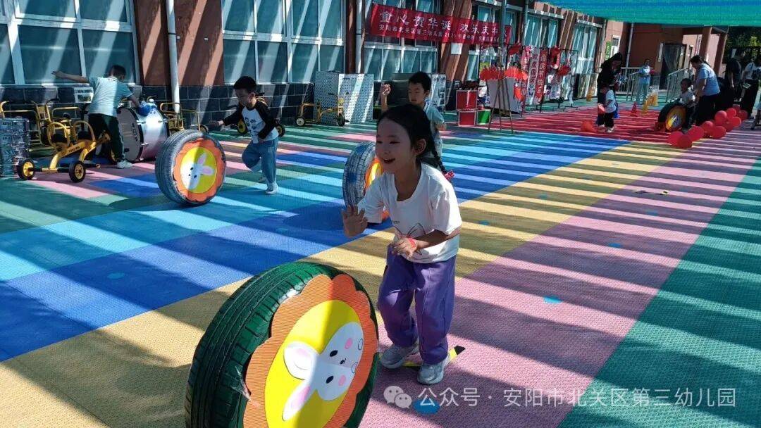 小朋友们化身“中秋小司机”,推动着贴满圆形月饼图案的轮胎奋力向前。轮胎咕噜噜地滚动,如同一只只巨大的月饼在地上飞速旋转。