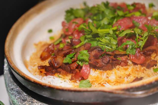 椰子鸡的好搭档必然是腊味煲仔饭,揭开砂锅的瞬间,腊肠与米的焦香交响曲即刻奏响。泰国香米粒分明,腊味油脂渗入锅巴,挖一勺能听见"咔嚓"脆响。建议先喝汤再拌饭,让椰香与碳水在舌尖跳双人探戈。