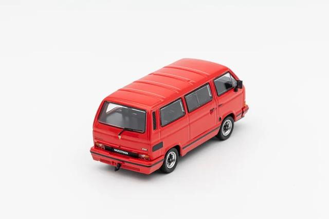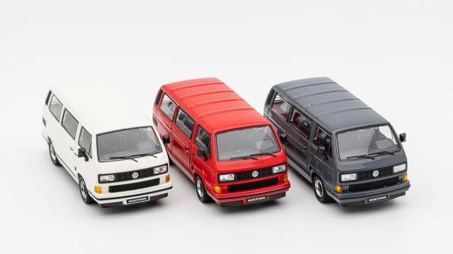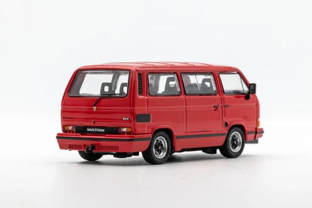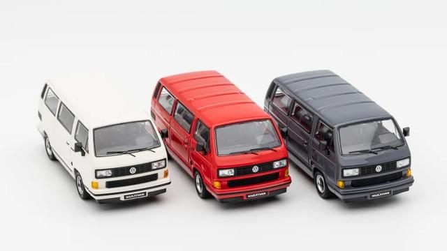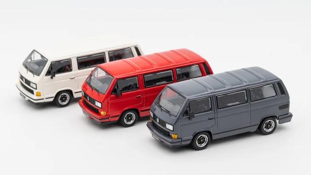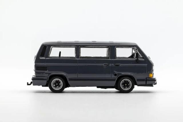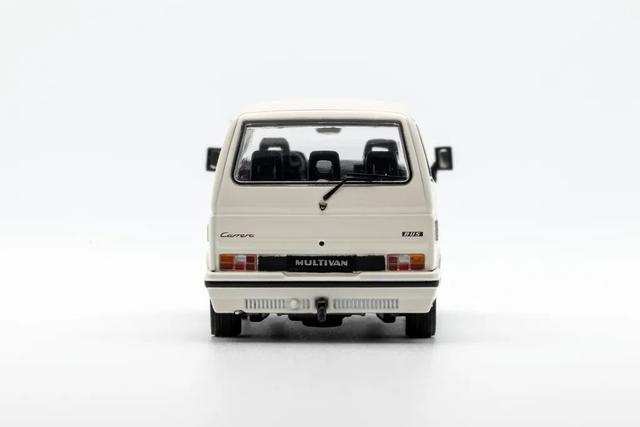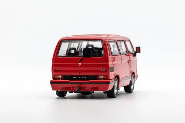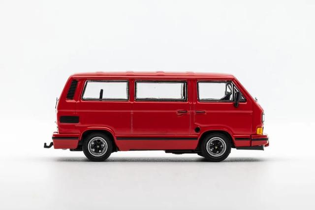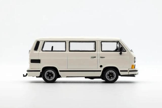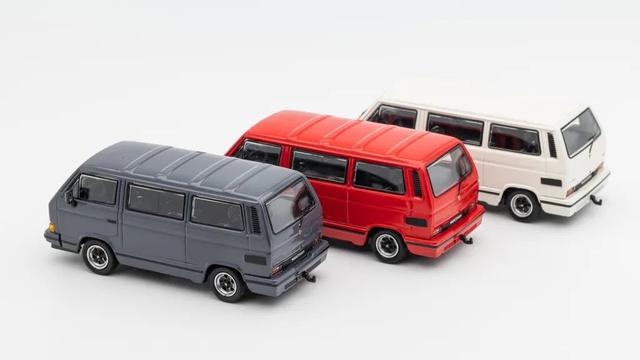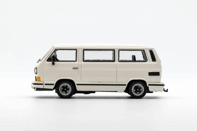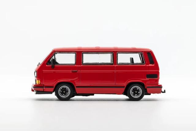 大众T3外形特点就是方方正正,而模型的外形还原也算到位,模型的前后杠均为分件,侧面的裙边为开模成型,前后杠和裙边都有黑色饰条,这个应该是移印的;这次试玩的3个B32分别为白色、深灰色、红色,漆面质感还行,白色偏黄一点,这个也是保时捷的特点之一,模型的缝隙也较为均匀;侧面门把手、侧后方的通风格栅以及D柱上的空调通风格栅都是用浮雕+移印的方式刻画,质感还行;车外后视镜为独立塑料件,颜色为黑色,但外形不够准确;车窗有黑色的边框,这个也是油漆刻画的。
