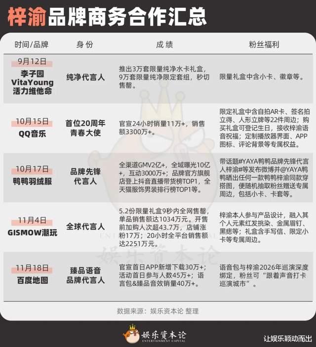 梓渝在此期间也收获5个品牌代言覆盖食品、潮玩、服饰、互联网等,甚至在QQ音乐官宣合作时,网易娱乐官方微博转发其合作微博,祝贺梓渝成为QQ音乐20周年青春大使,话题“网易恭喜QQ音乐”一度冲上微博热搜,成为两个平台两年以来的首次互动。