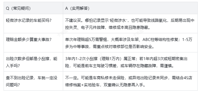 第三步:多形式科普解读,记录+车况双重核验光查完记录不够,还要精准解读、实地验车。下面用问答、表格结合的形式,帮你理清核心疑问、找准车况痕迹,双重保险杜绝踩坑。