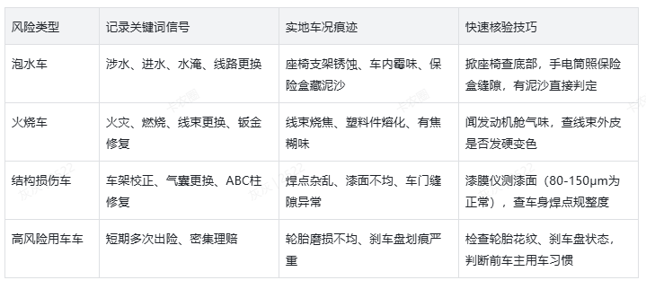 关键判断:报告标注 “纵梁修复”“气囊更换”“火烧后电器维修” 等,直接判定为问题车,终止交易。