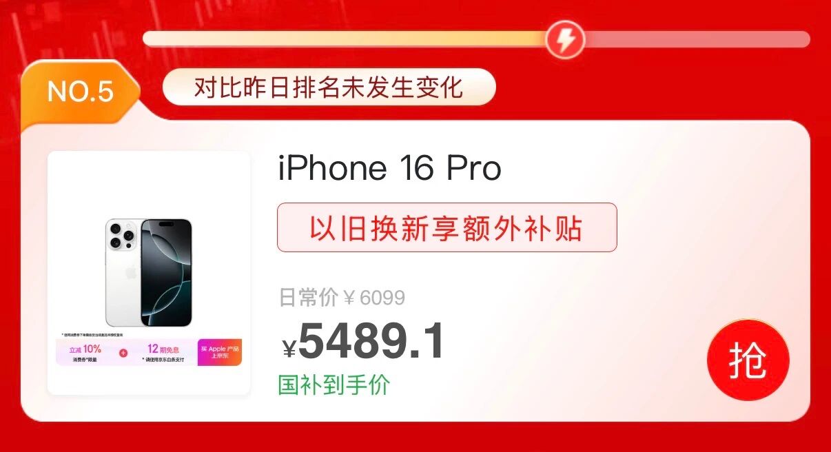 在京东双 11 手机销量竞速榜中,目前 iPhone 16 Pro 的实时排名是第五,仅次于 iPhone 17 系列和荣耀 X70。