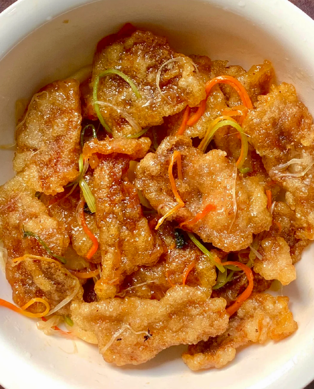 谁能拒绝这盘金黄油亮、酸甜开胃的锅包肉?刚出锅的肉片裹着晶莹透亮的糖醋汁,咬下去先是“咔嚓”一声脆响,接着是里脊肉的滑嫩多汁在嘴里化开,酸中带甜、甜里透香,还有一丝若有若无的姜丝清香解腻提鲜。刚端上桌还没拍照,孩子已经夹走一块喊“比饭店还好吃”,老公连盘底的糖醋汁都想蘸馒头——这才是家常复刻成功的高光时刻!