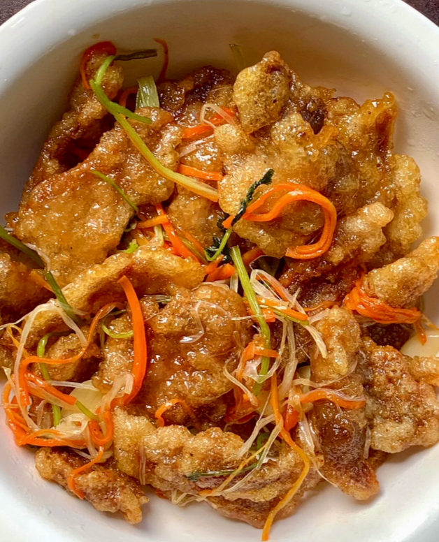 趁热吃才最过瘾!外皮酥脆如薄壳,内里肉质嫩滑弹牙,糖醋汁酸甜清爽、不黏不腻,姜丝的微辛恰到好处地中和甜味。配一碗白米饭是东北风味主食,当宴客菜也毫不逊色,连吃三块都不腻!