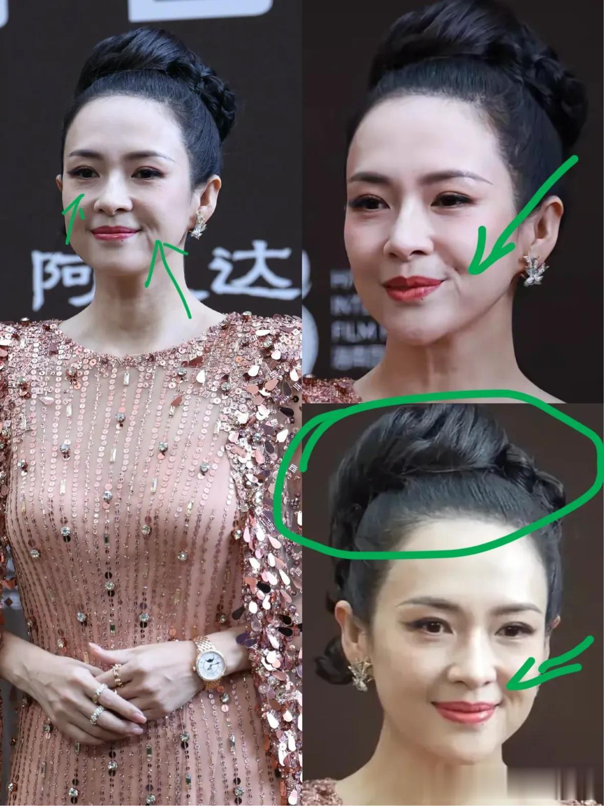 镜头一拉近,46岁的她,脸上岁月留下的痕迹还是挺明显的,脸上除了细纹之外,越来越有种挂不住肉的感觉。再加上这个很显老气的盘发,使她今天整体造型大打折扣。