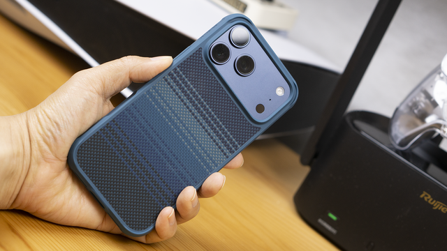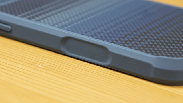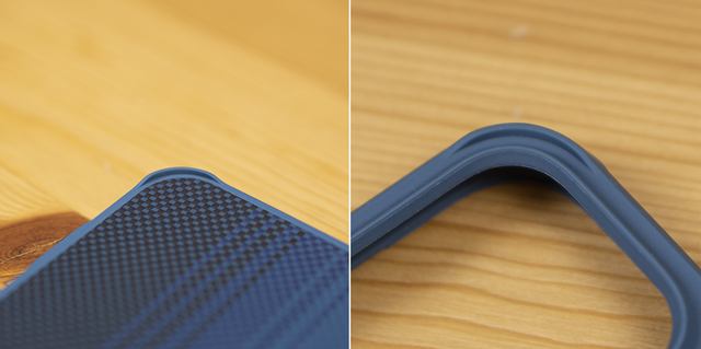 与PITAKA家以前手机壳不同。本次硬核防摔的手机壳,采用了边框全包裹的设计。高弹的TPU与芳纶纤维材质的背板相互嵌套,看上去还是很有新意的。