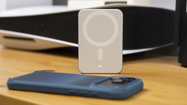 它的磁吸接口端,覆盖了软性的硅胶材质,在充电宝的下方有一排电量指示灯,它的无线输出功率为15瓦。