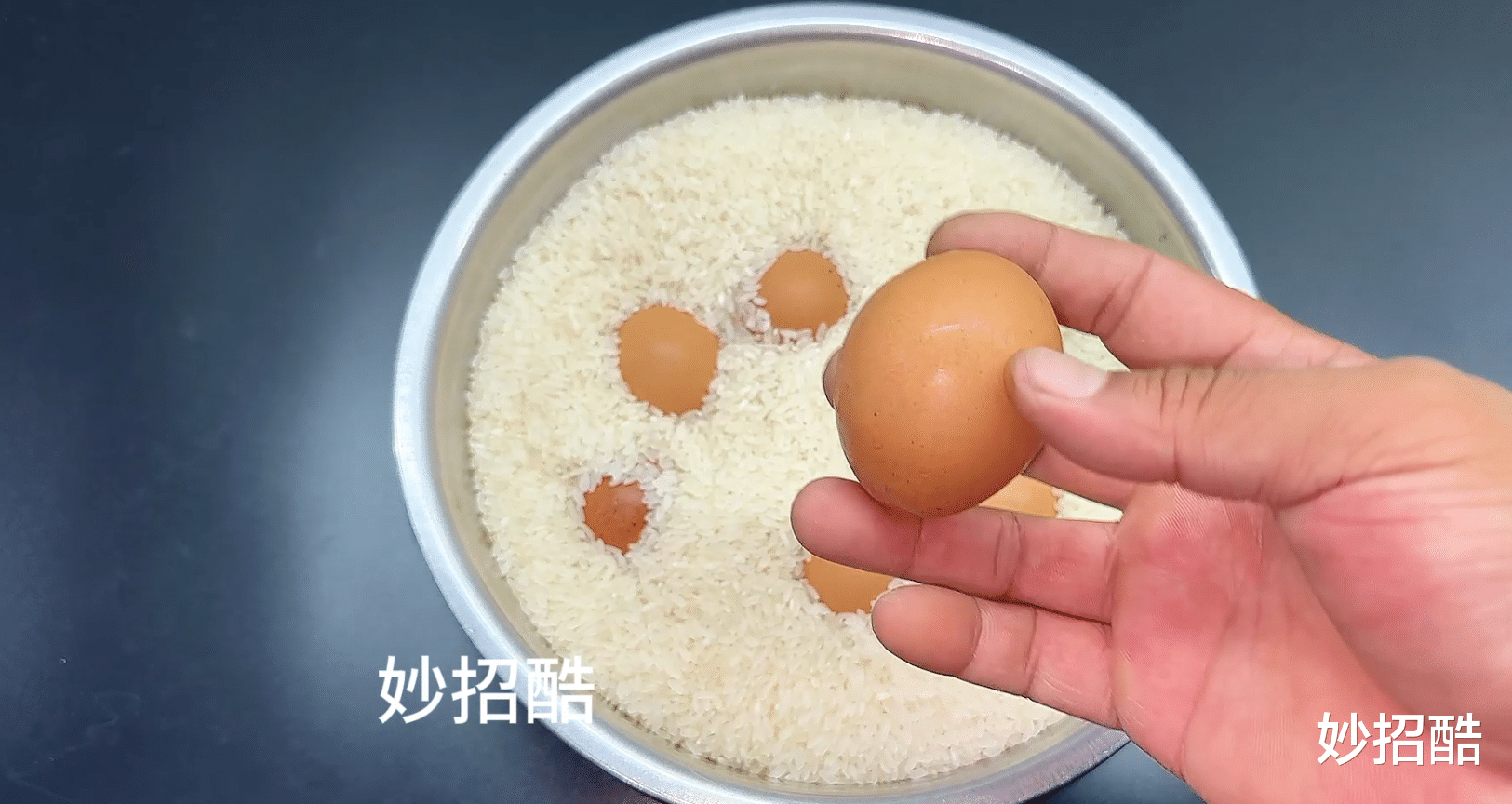 第二,把鸡蛋放进大米里。