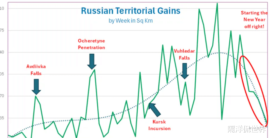 在这部分,我们来看一下战局上的变化。下图是一位分析人士根据“猫头鹰项目开源情报小组”的数据制作的、自 2024 年初以来俄罗斯每周在乌克兰占领的领土净量。图表底部的日期是一周的开始,一些关键事件也被标注以提醒人们在什么时候发生了什么大的事件,从左到右依次是:阿夫迪夫卡沦陷、奥切雷泰因渗透、库尔斯克入侵、武赫勒达尔沦陷。