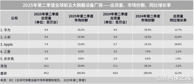 根据国际数据公司IDC最新报告显示,2025 年第二季度全球腕戴设备市场出货量达4922万台,华为以990万台出货量、2