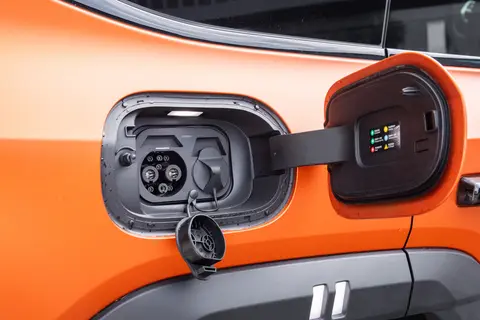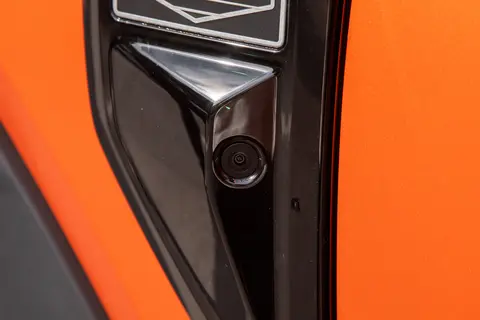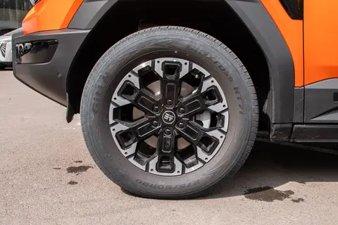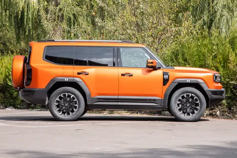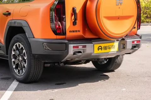 车身侧面同样细节满满,A/B/C柱采用全黑涂装营造悬浮车顶视觉效果,车身同色外后视镜与传统造型车门把手保持简约风格,车顶标配行李架满足装载需求。侧裙位置覆盖大面积防擦条,有效抵御越野时的剐蹭;轮眉上方点缀两点式轮眉灯,夜间点亮辨识度十足;A柱下端预留拓展接口,可按需加装射灯,底部双侧外露式拖车钩与隐藏式排气设计,在保留硬派属性的同时兼顾尾部整洁度。