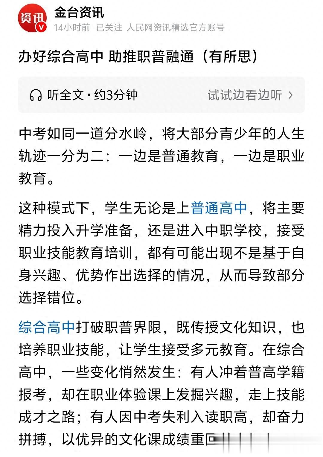 官媒下场再提综合高中建设的意义,在传统职普分流弊端很明显的背景下,建设综合高中意义非常重大!