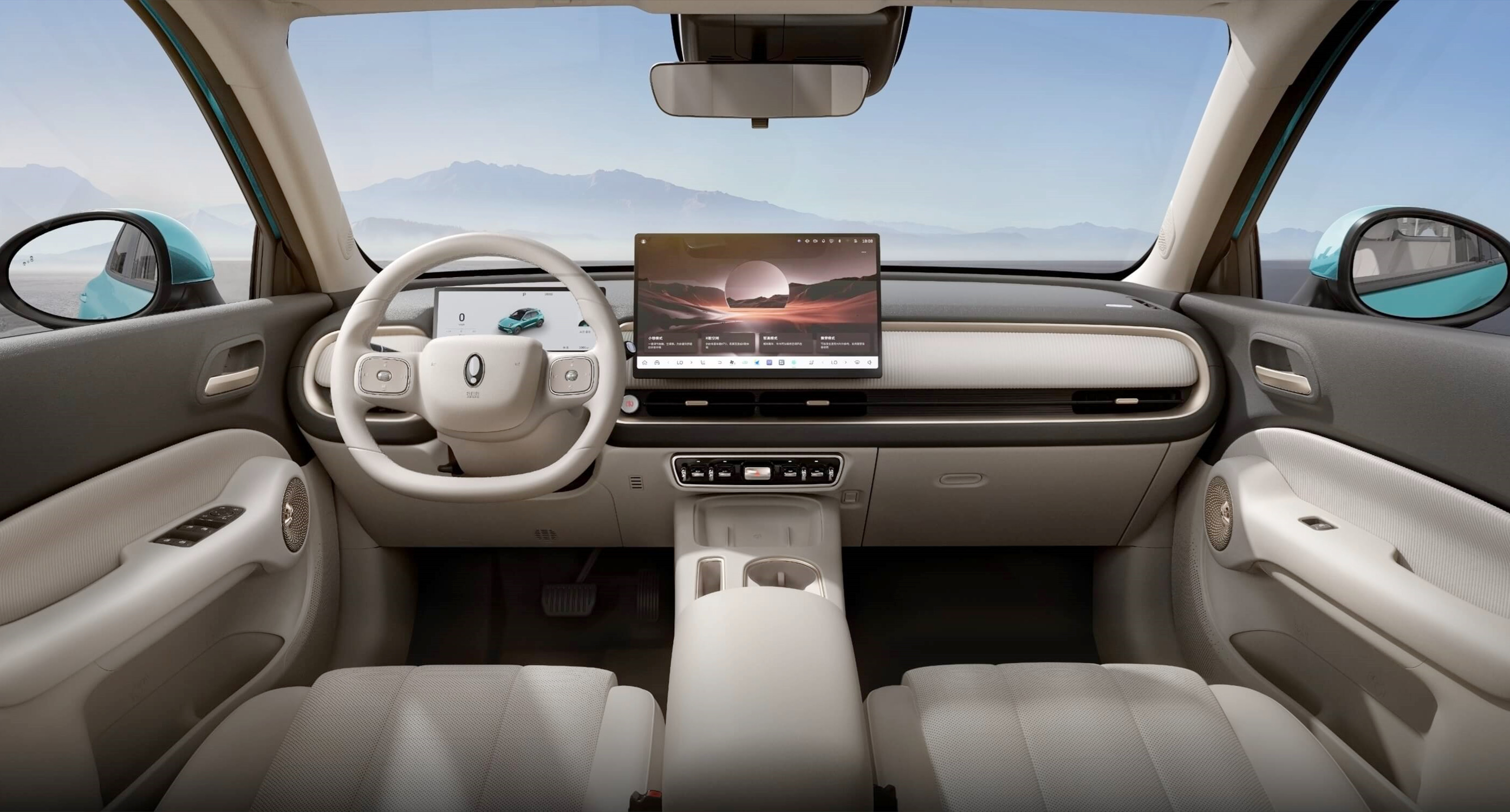 进入车内,记者发现欧拉5的整体内饰氛围比较简约,纯色双辐式方向盘后有液晶仪表屏,旁边是15.6英寸大尺寸中控屏,采用Coffee OS 3系统,支持智能语音助手、OTA升级、手机互联等功能。空调出风口下方保留部分物理拨杆,样式复古,镀铬材质看上去蛮有质感。此外,新车车内采用环保材质与织物/皮质混搭座椅,细节处加入金属饰条与氛围灯点缀,提升整体质感。