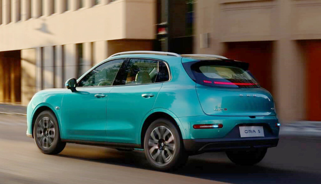 车尾部分,欧拉5的整体造型相对简洁,尾灯采用与好猫相似的“地平线”尾灯组设计,配备车顶扰流板并内嵌高位刹车灯组,尾门中央处悬挂“GWM”车标,视觉辨识度非常高。